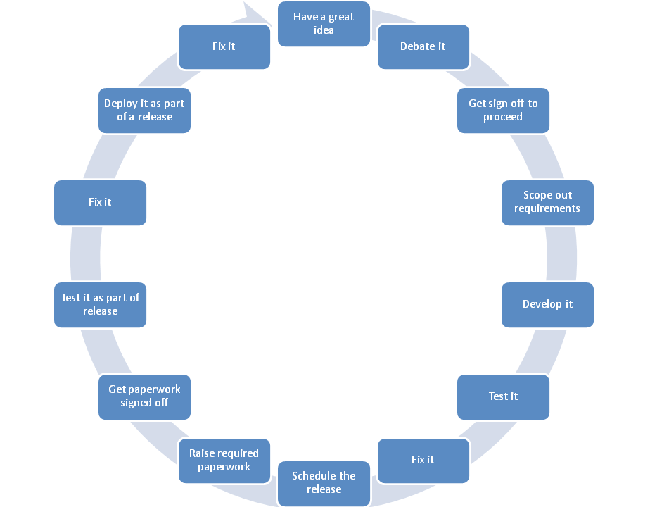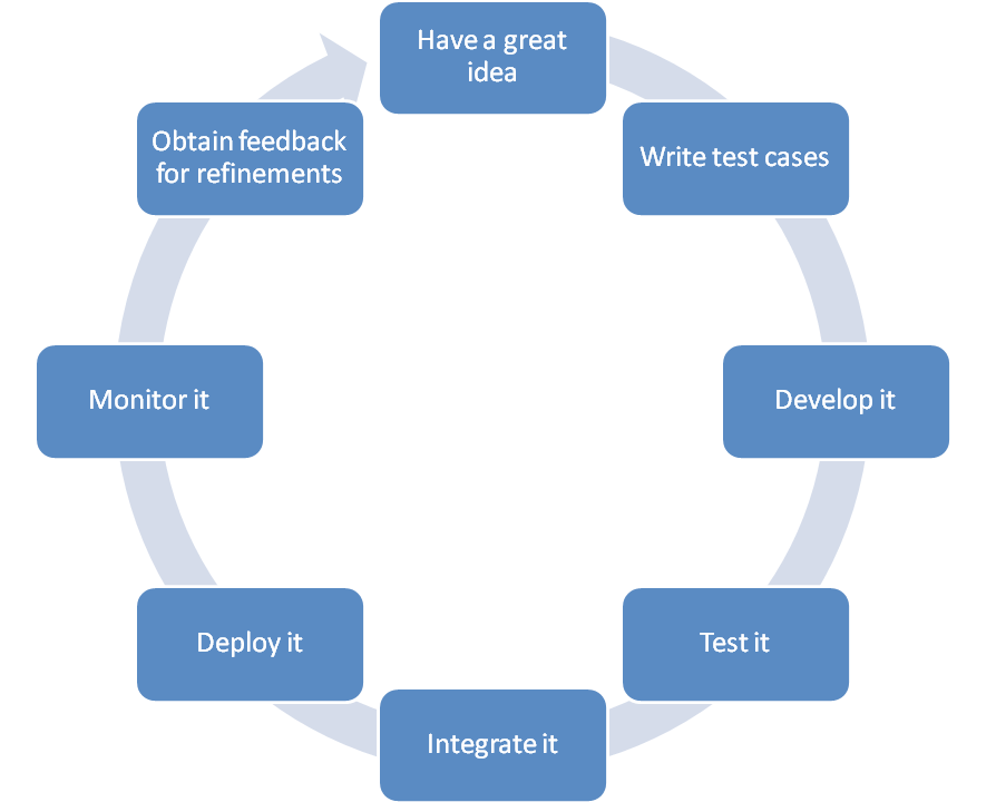 | Un código único en un entorno determinado (testing, staging, production u otros) | Un enorme paquete de cambios que se entregan a otra persona para resolver. |