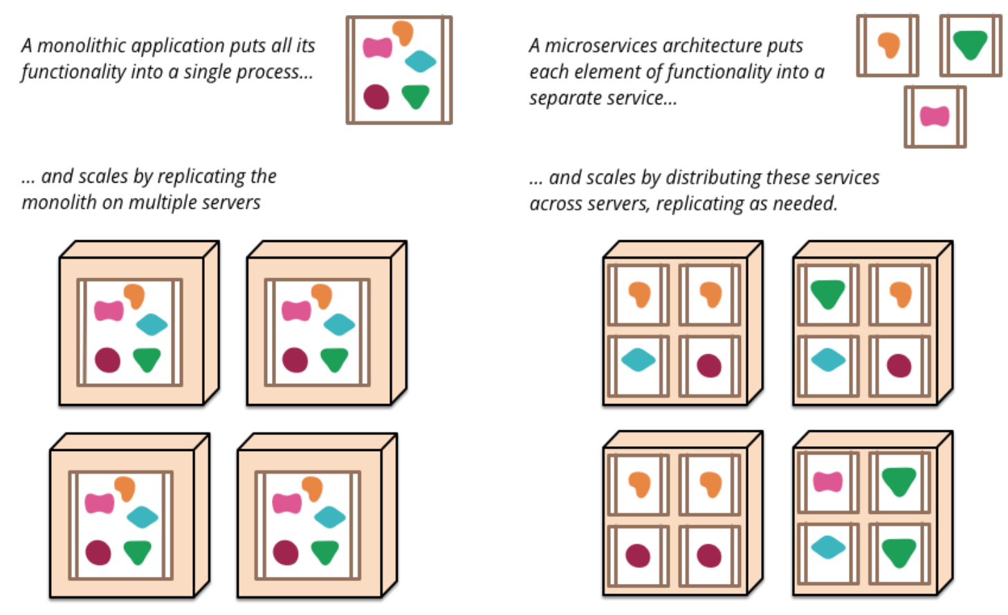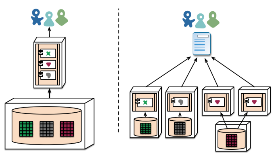 En aplicaciones monolíticas se suele usar una sola base de datos donde conviven todas la información que necesitan los módulos. Se usa la misma plataforma para todas las aplicaciones de la organización